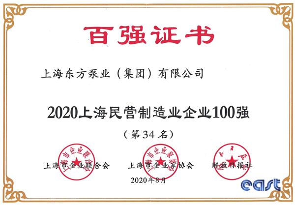 上海東方泵業(yè)(集團)有限公司憑借出色的銷售業(yè)績和良好的社會口碑,通過專家委員會的審定,分別榮獲《2020上海制造業(yè)企業(yè)100強》第59名、《2020年上海民營制造業(yè)企業(yè)100強》第34名。東方泵業(yè)入圍百強榜單,是對東方泵業(yè)經(jīng)營發(fā)展的肯定。未來,東方泵業(yè)將繼續(xù)強化使命與擔當,充分響應國家號召,逆勢而上,穩(wěn)中發(fā)展,秉承“誠信、創(chuàng)新、務實、共贏”的經(jīng)營理念,堅持客戶至上、精益求精的品質(zhì)方針;通過良好的產(chǎn)品和服務,保障用戶生產(chǎn)、生活,促進經(jīng)濟增長,提升人民福祉。為后疫情時代經(jīng)濟持續(xù)健康發(fā)展做出貢獻,再創(chuàng)佳績。